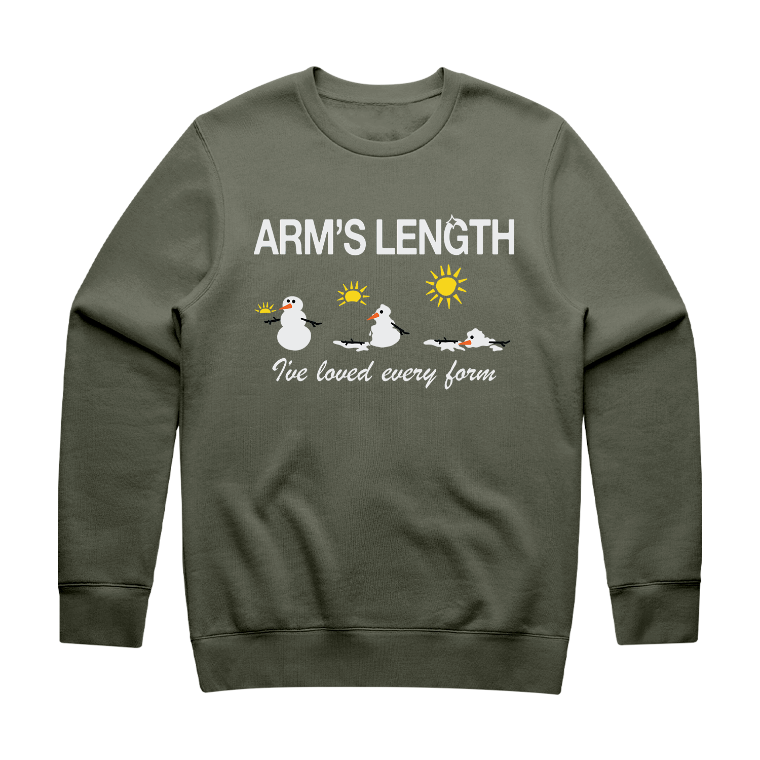 80% cotton / 20% polyester blend unisex crewneck sweatshirt with a standard fit featuring a snowman design.